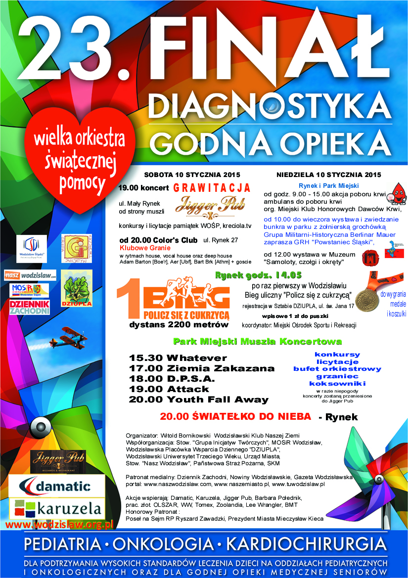 po 14.00 po raz pierwszy w Wodzisławiu organizowany jest Bieg uliczny "Policz się z cukrzycą" włączając imprezę w szereg biegów organizowanych w innych miastach - RYNEK - PARK MIEJSKI – org. MOSIR, rejestracja w Sztabie; opłata startowa 1 zł do puszki - do wygrania medale i koszulki 9 Biegu WOŚP,